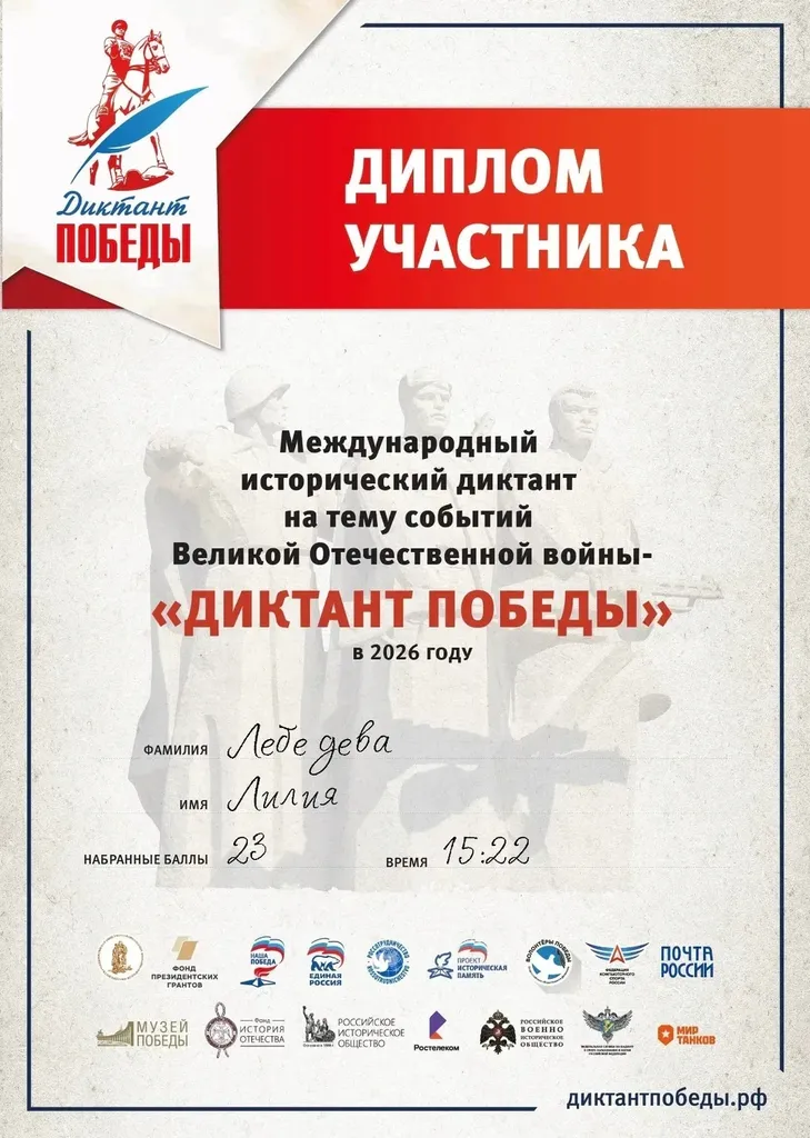 «Диктант Победы» — это одна из самых масштабных международных просветительских акций. Её главная цель — сохранить память о героических страницах нашей истории, пробудить интерес к изучению событий Великой Отечественной войны и отдать дань уважения тем, кто сражался за Родину.
